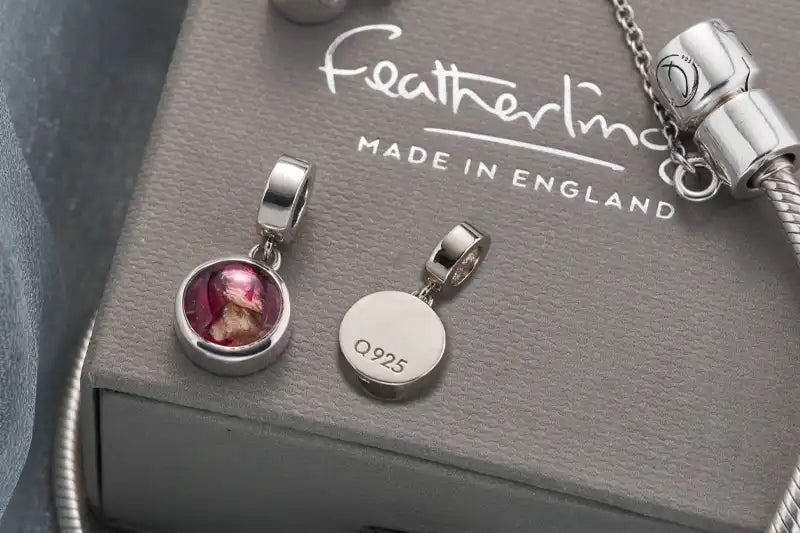 All of our memorial/photo jewellery is made from .925 Sterling Silver. Any charms that then have rose gold detailing will be 18ct Rose Gold. Charms that have gemstones i.e Sapphire or CZ will be noted in the description!