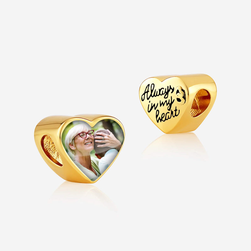 'Always in my heart' Pandora Compatible Personalised Photo Charm features your photo on the front and "Always in my heart" engraved on the back. Made from 925 silver, with gold plating, it fits Pandora, Lovelinks, and Chamilia bracelets.