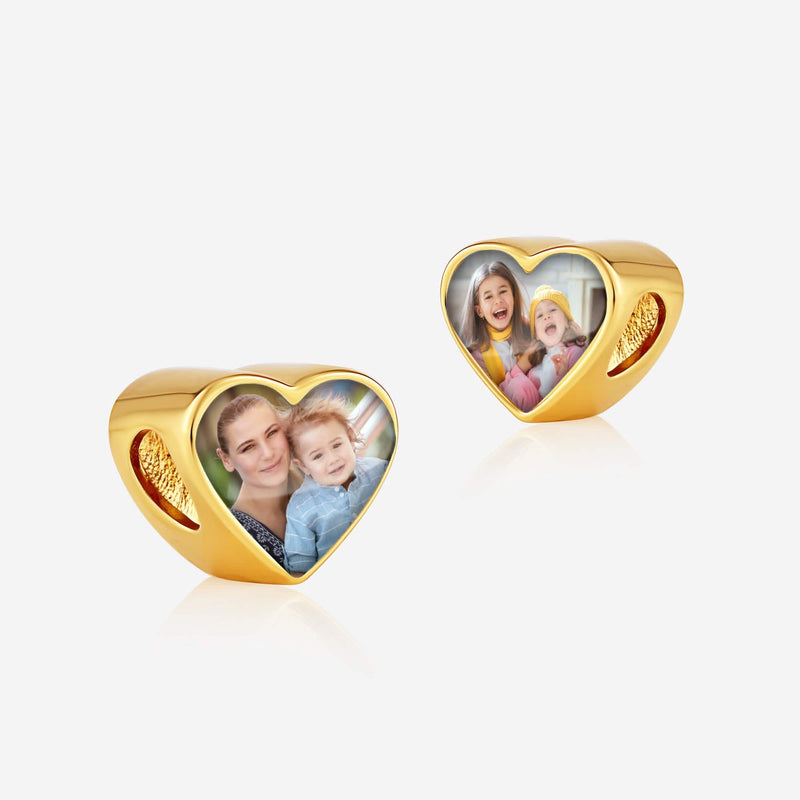 Double Photo Charm is a heart-shaped sterling silver charm with gold plating that holds two pictures on either side. All personalised charms are designed to fit Pandora and other popular brands