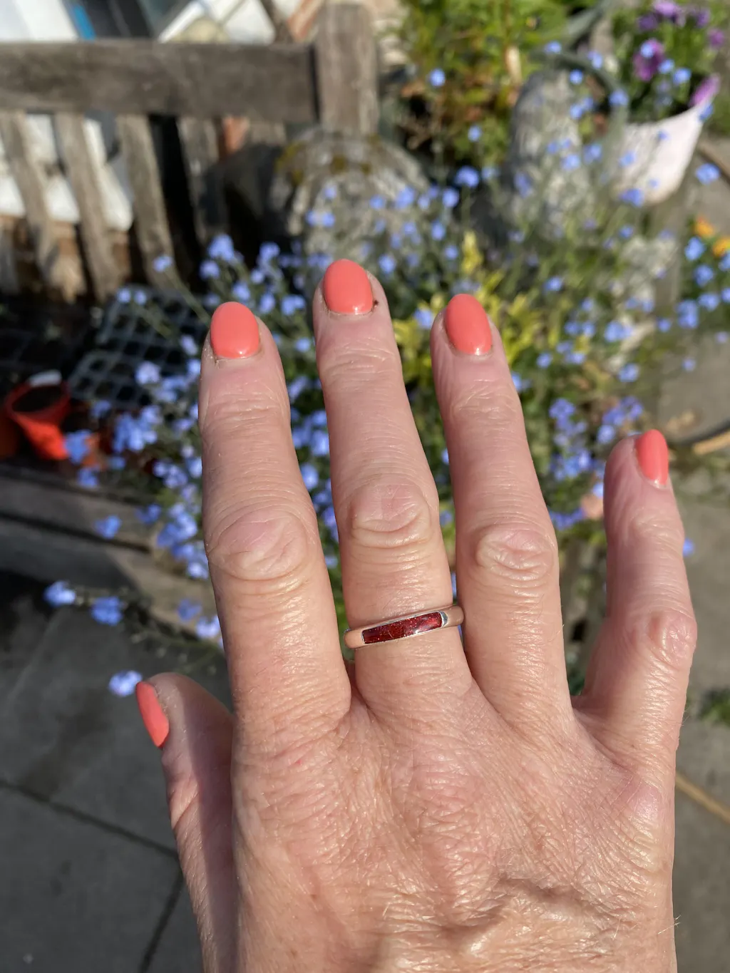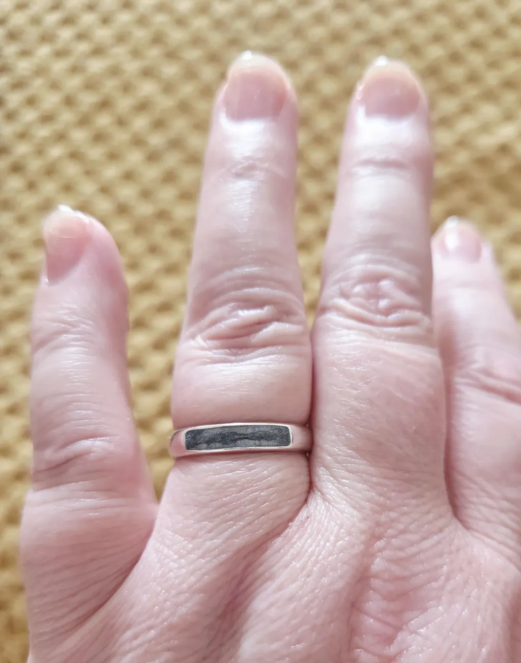 You can choose wether you would prefer the ashes to be visible or hidden in your Petite Channel Ashes Ring. You can also use hair or fur. Please note that all ashes are different.