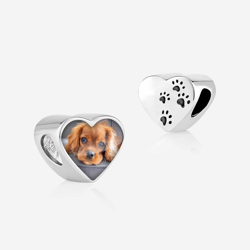 'Pet paws' Pandora Compatible Personalised Photo Charm features your photo on the front and four little paw prints engraved on the back. Made from 925 silver, it fits Pandora, Lovelinks, and Chamilia bracelets.