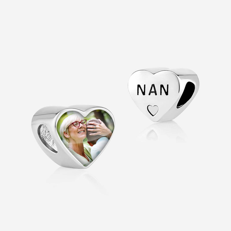 'Nan' Pandora Compatible Personalised Photo Charm features your photo on the front and "Nan" engraved on the back. Made from 925 silver, it fits Pandora, Lovelinks, and Chamilia bracelets.