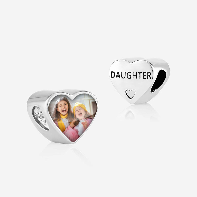 'Daughter' Pandora Compatible Personalised Photo Charm features your photo on the front and "Daughter" engraved on the back. Made from 925 silver, it fits Pandora, Lovelinks, and Chamilia bracelets.