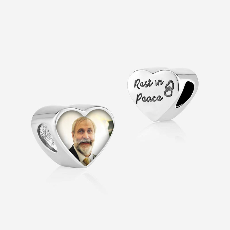 'Rest in Peace' Pandora Compatible Personalised Photo Charm features your photo on the front and "Rest in Peace" engraved on the back. Made from 925 silver, it fits Pandora, Lovelinks, and Chamilia bracelets.