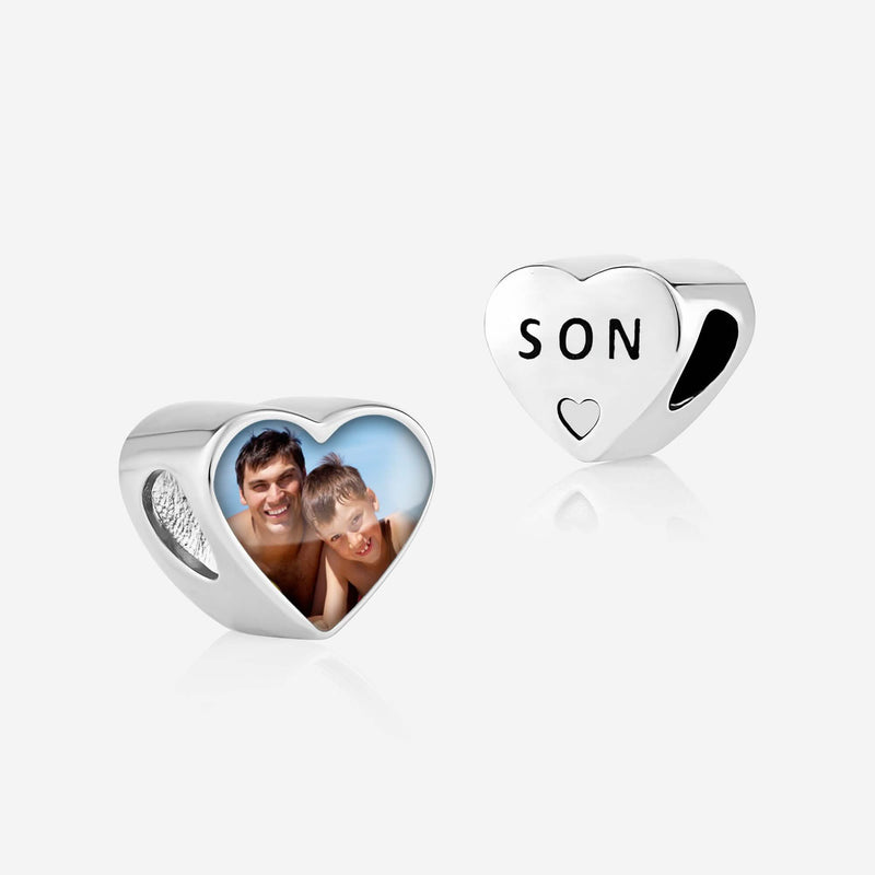 Introducing our 'SON' Pandora-Compatible Personalised Memorial Charm. Personalise it with a cherished photo on the front, creating a unique and treasured piece of jewellery. The back is engraved with "SON".