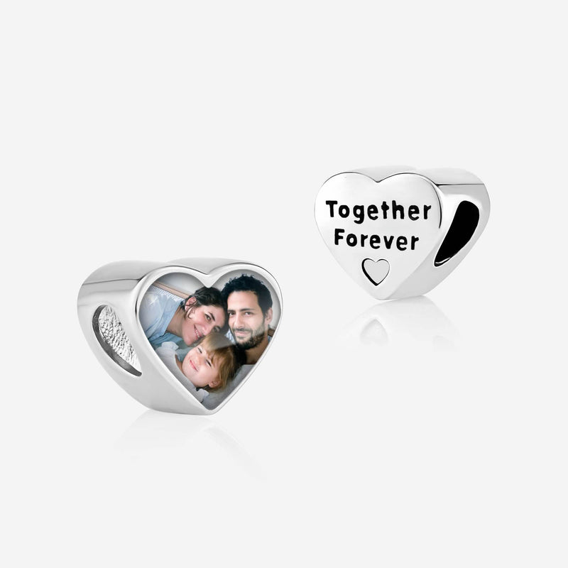 'Together Forever' personalised charm Designed to fit Pandora. Made using sterling silver with your photo on the front! Waterproof and made here in Portsmouth UK. Every personalised charm comes gift boxed with a polishing cloth and free UK delivery.